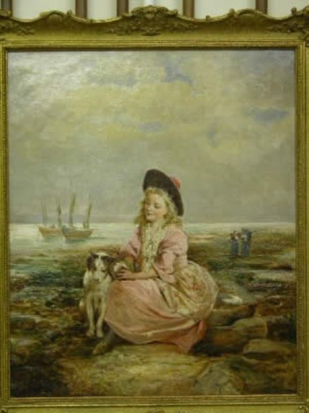 | young girl on beach wearing Tam O' Shanter and having dog at her side | |