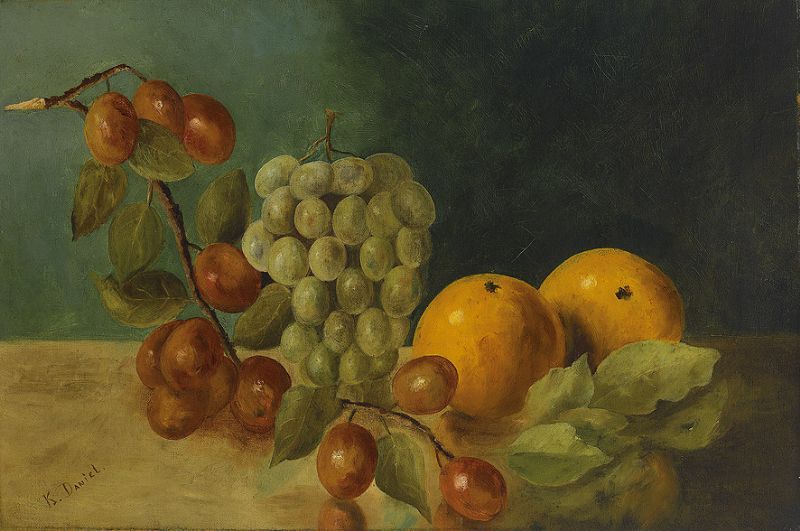 Früchtestilleben mit Orangen, Traubenrebe und Pflaumenast