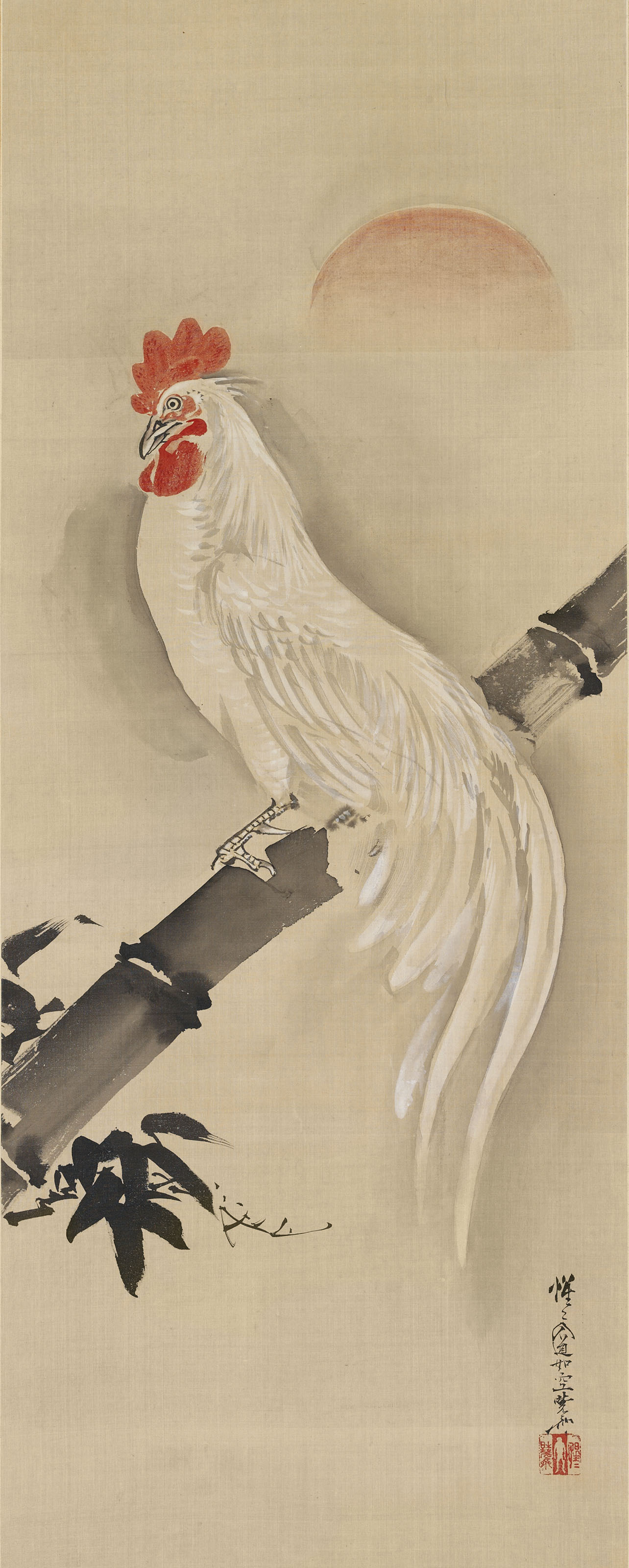 COCKEREL ON A BAMBOO BRANCH AT DAWN