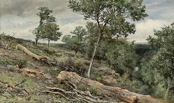 A figure resting in a wooded river valley in Gretna