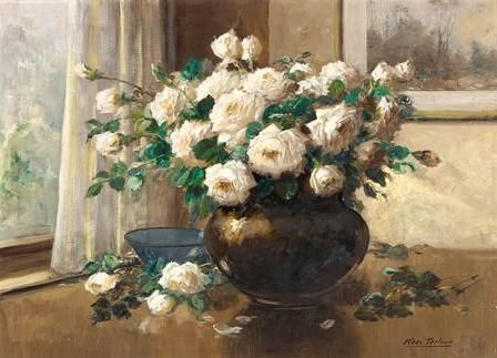 Weißer Rosenstrauß am Fenster vor Bildhintergrund.