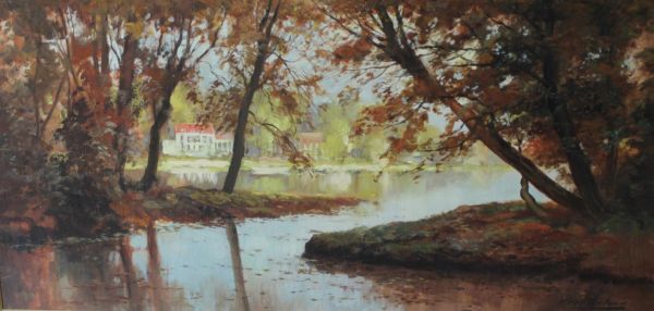 A lake scene with country house in the background