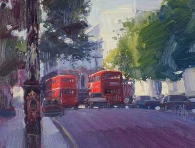 City street scene with double decker busses