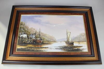 | Wooded river landscape with boats, figure beside two cottages on the shore | |