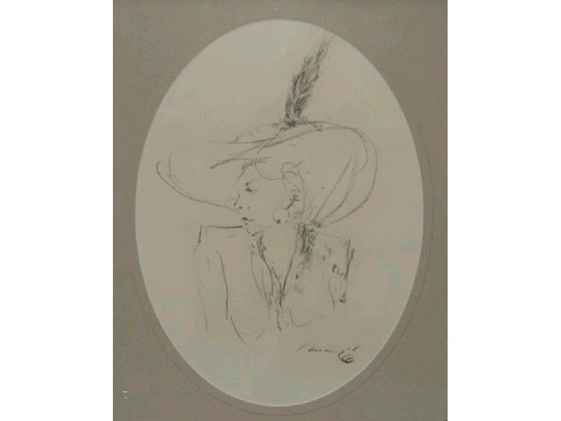 A study of a lady, head and shoulders wearing a wide brimmed hat,