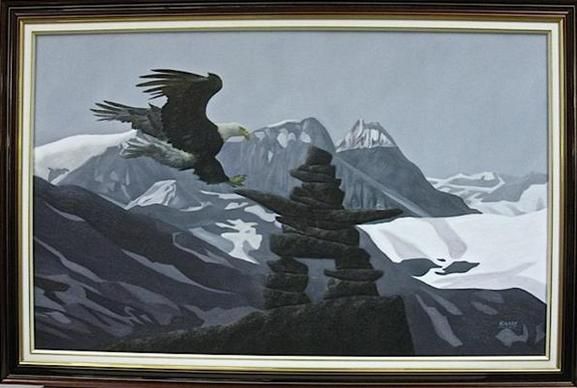 UNTITLED (EAGLE FLYING BY INUKSHUK)