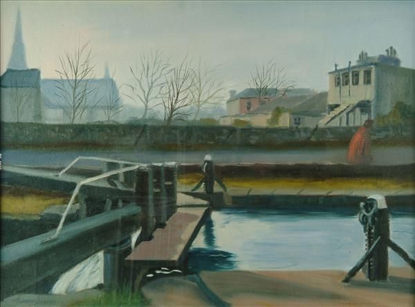 Lock with church and houses in the distance