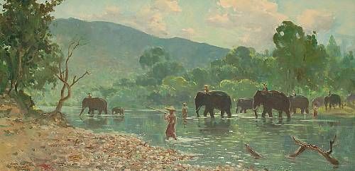 Working elephants crossing a jungle stream