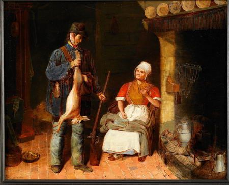| Köksinteriör med handarbetande kvinna och jägare med skjuten hare | |