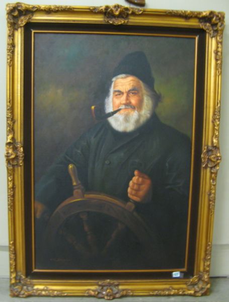 Portrait of white-bearded, pipe smoking sea captain at ship's wheel