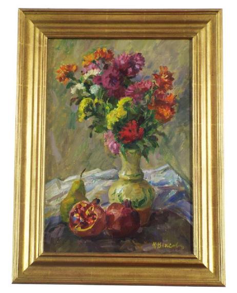 | Still life of flowers in a vase with a pear and pomegranate in the foreground | |
