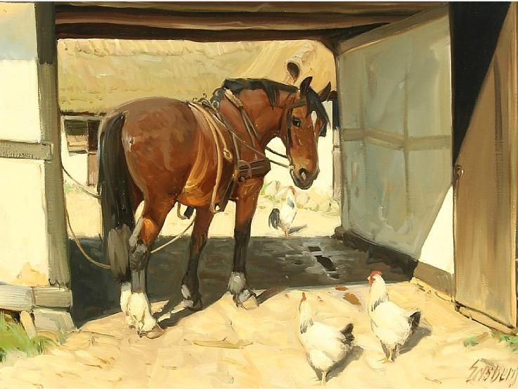 A farm scene with a horse and chickens.