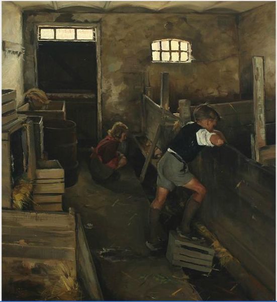 Interior of a barn with two children looking at the animals