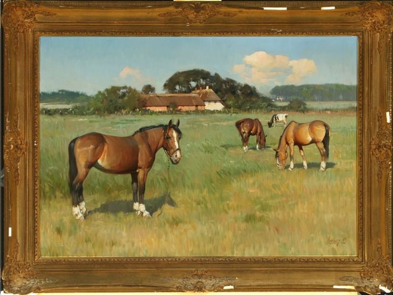 Landscape with horses and a cow in the field