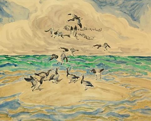Coastal scenery with Barnacle geese and Eiders on a sandbank