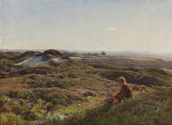 Hilly moorland with a girl picking berries.