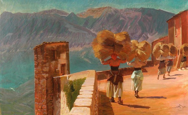 Italian landscape with women bringing home the harvest
