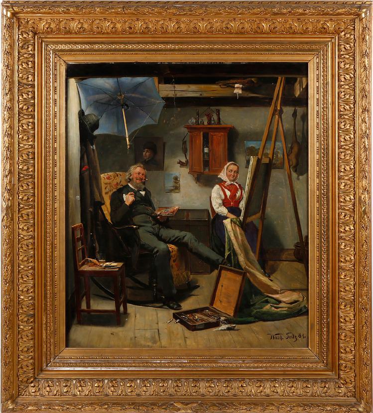 Interiör från ateljén med konstnären och modell