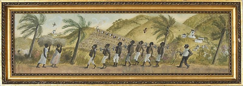 Övervakade slavarbetare i böljande jordbrukslandskap.