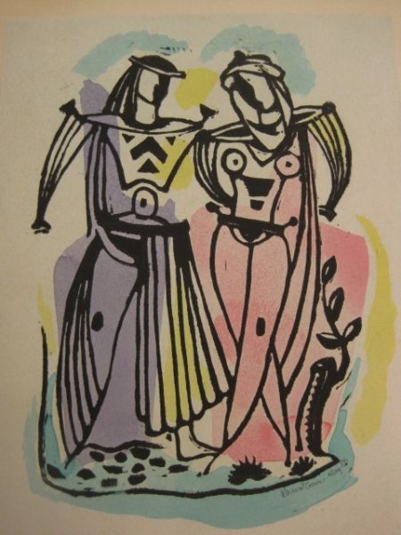 | Linoleum cut with hand coloring in watercolor on cream wove paper mounted on thin cardstock | |