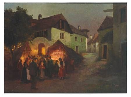 Zahlreiches Volk vor beleuchteten Marktständen an der Kirchweih.