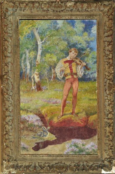 Geige spielender Jüngling und Schlange am Bach in Heidelandschaft