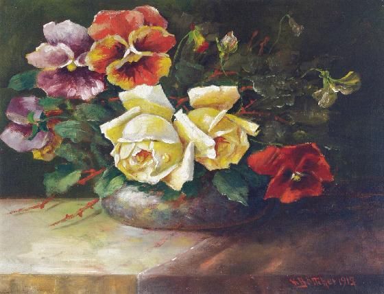 Stilleben mit Rosen und Stiefmütterchen