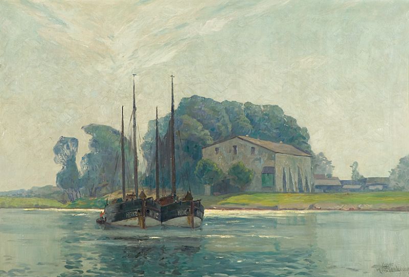 Dunstiger Sommertag am breitem Fluss mit zwei Kuttern.