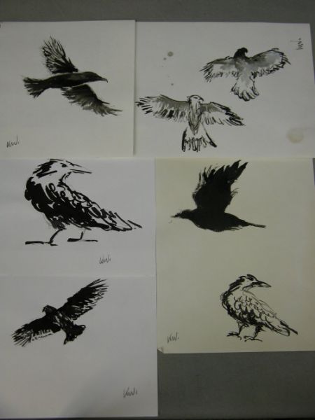 bird studies, five, flying Crow, standing Raven, flying Buzzards (2), and standing and flying Crows
