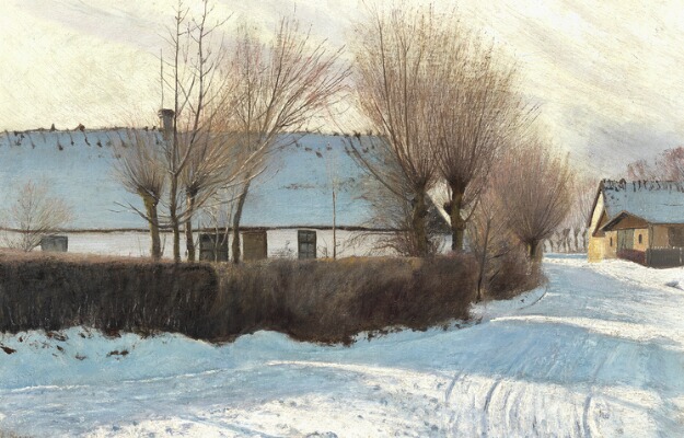 | Snowcovered road in Baldersbrønde with strong shadows from a whitewashed, thatched house | |
