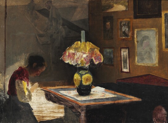 | The artist's wife Sigrid sewing in the lamplight. Karrebæksminde | |
