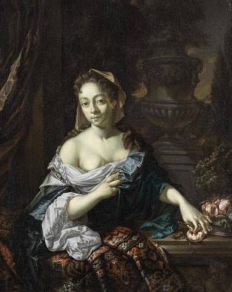 Portrait of a lady, half-length, seated, in a blue dress and holding a rose