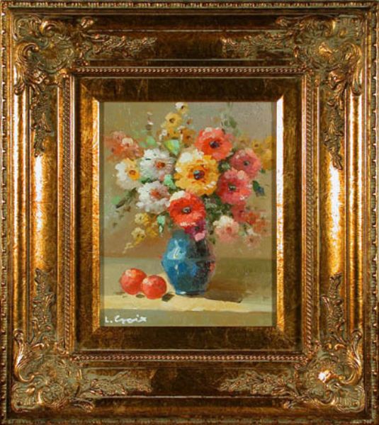 Blaue Vase mit prächtigem Anemonenstrauß, daneben einige Früchte