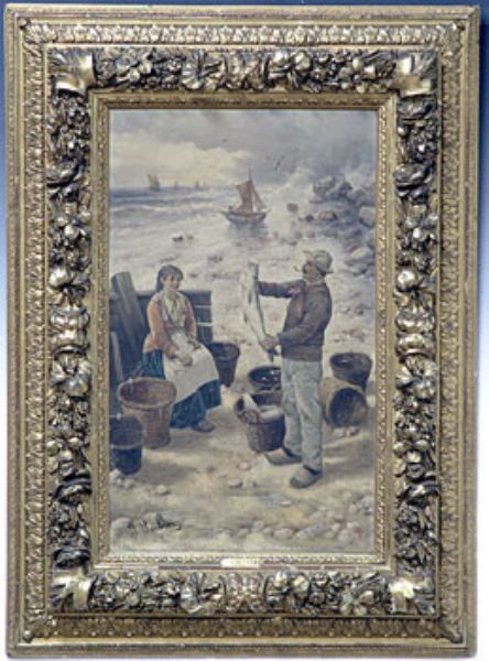 | Strandpartie: Fischerin und Fischer mit ihrem Fang, im Hintergrund Fischerboote. | |