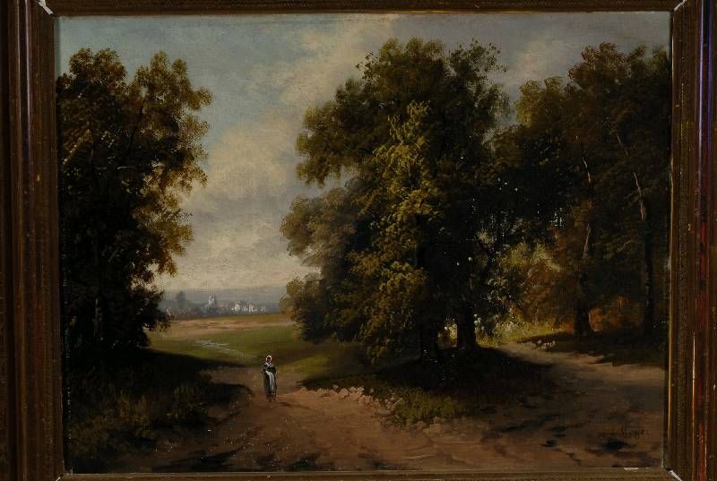 Landschaftsdarstellung mit Blick auf ein Dorf, im Vordergrund Magd