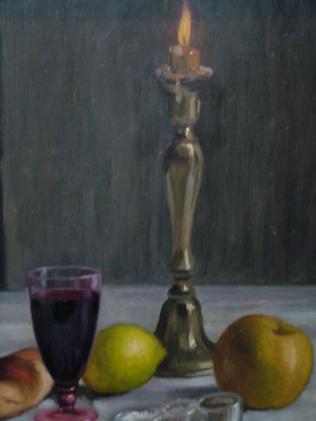 Still life of fruit, a wine glass and a candle
