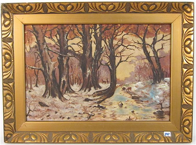 Primitive style winter landscape with deer