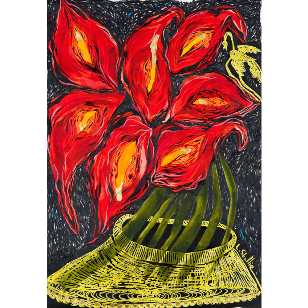 Ink , watercolour, oil pastel and gold leaf on paper