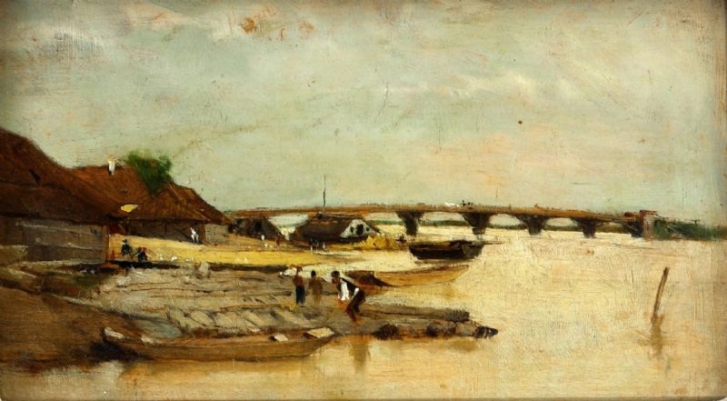Flusslandschaft mit Booten, Brücke und Häusern