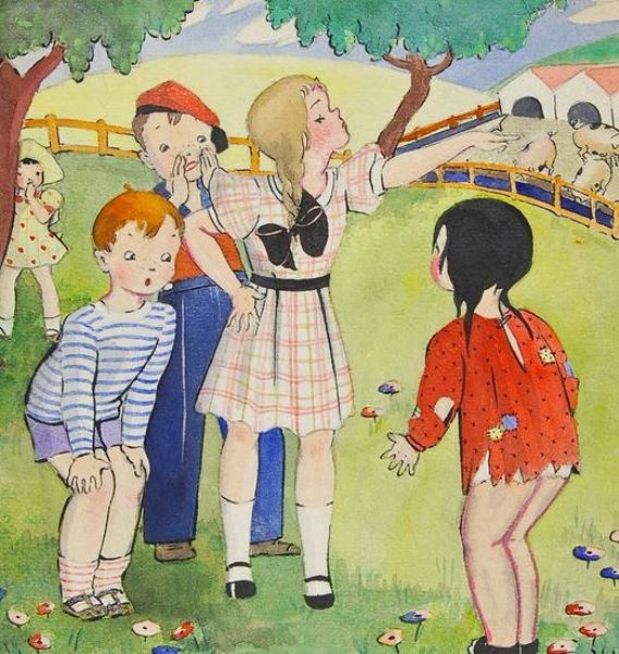 Children in a field over looking a farm