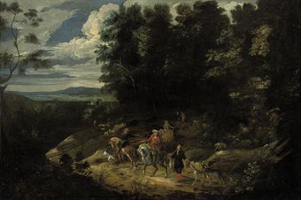 A hunting party in a wooded landscape