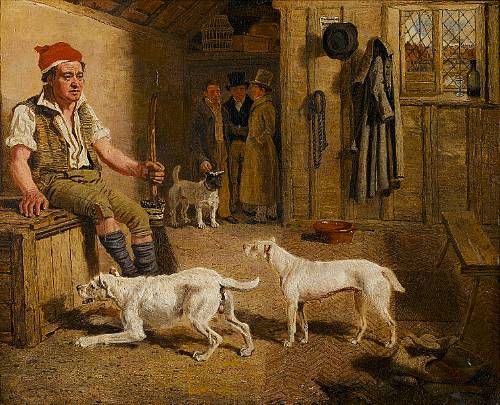 An interior scene with a servant and Parson Jack Russell Hunt Terriers