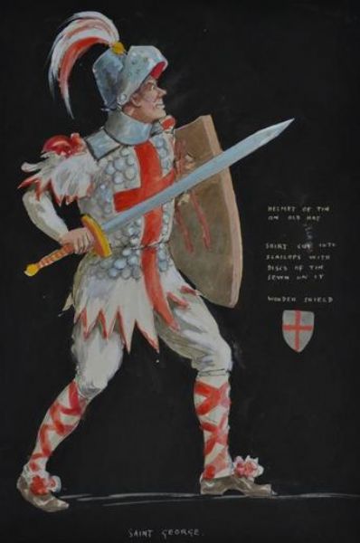 | Five costume designs for mummers - 'Saint George', 'The Dragon', 'A Leech', 'A Valiant Soldier' and 'The Saracen' | |