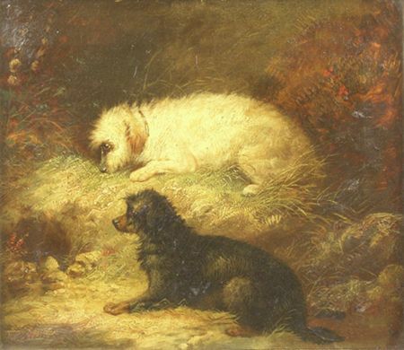TWO TERRIERS BESIDE A RABBIT BURROW