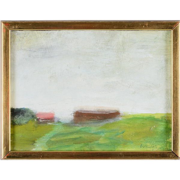 Grönskande landskap med inslag av två byggnader. Ram med smärre slitage