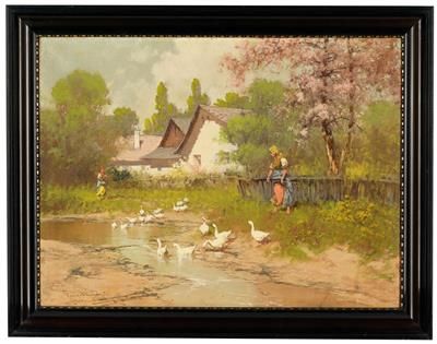 2 Mägde mit Gänsen an einem Bachlauf hinter dem Haus
