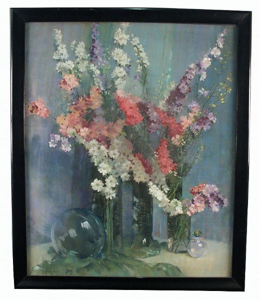 FLORAL STILL LIFE WITH LARKSPUR AND GLASS ORB