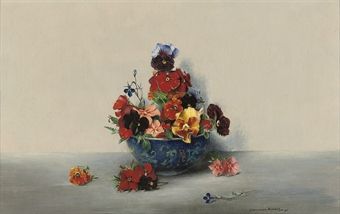Pansies in a blue bowl
