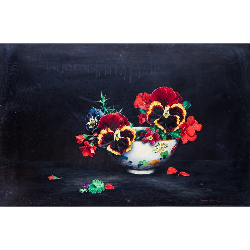 | Still life of Pansies, Pelargoniums and Primula in a bowl with Alpine rockery Phlox foliage | |