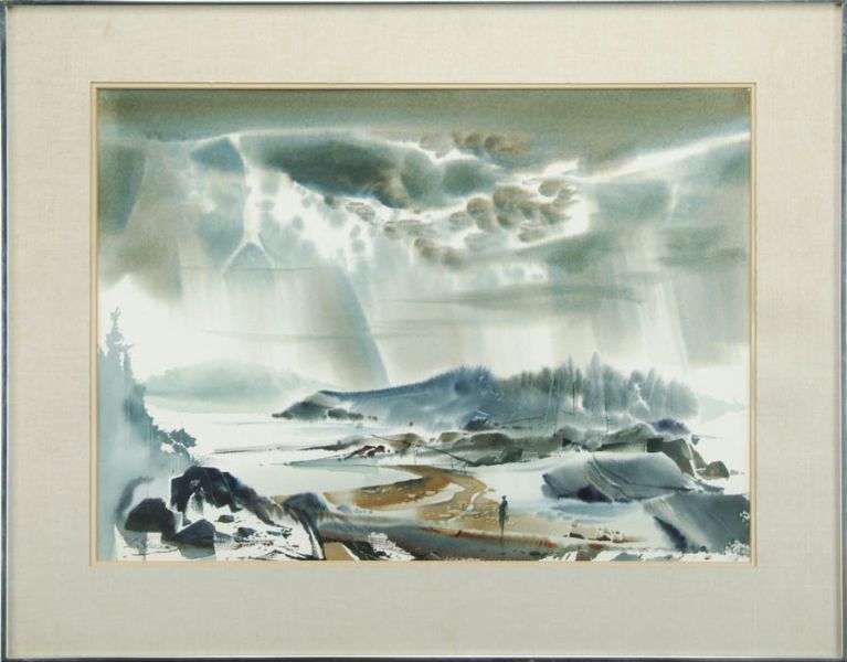 | Watercolor Maine cove with tidal pools having a lone figure with bucket presumably collecting shells. Abstract scene with rain which appears to have a passing rain shower | |